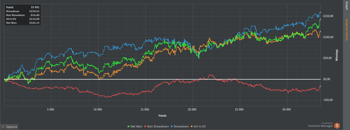 Banrkoll Start = 362,31$ ---> +143,13$ ---> Bankroll Stop = 505,03$ (выполнена на 103,9%) Дистанция >17K рук ---> 33518 (выполнена на 197,1%)