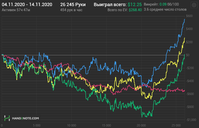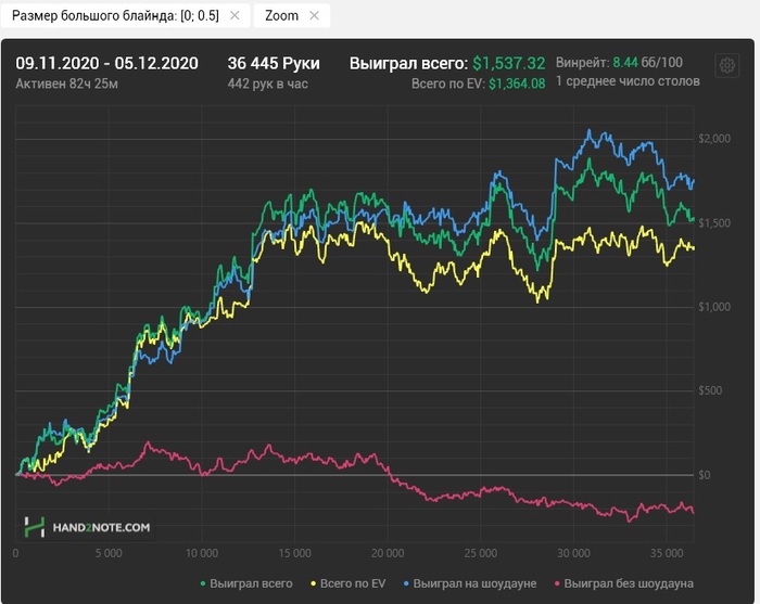 Охренеть, какое приятное чувство. Когда полгода большую часть времени садишься в отвратительном психологическом состоянии за столы в надежде, что сегодня карты помогут и ниже то уже некуда. Ведь у меня за предыдущие 400к рук было 5/100 с конским рейком чико. Но дно, как оказывается, может быть еще далеко). Как вам эти 3 стрикана на графике, когда подбираешься к годовой отмазке и тебя просто укатывают в строчку на предыдущий чекпойнт? Насколько помню, такого чувства беспомощности в покере я не испытывал никогда и никому не пожелаю. Но может послезавтра меня ждет очередной виток)