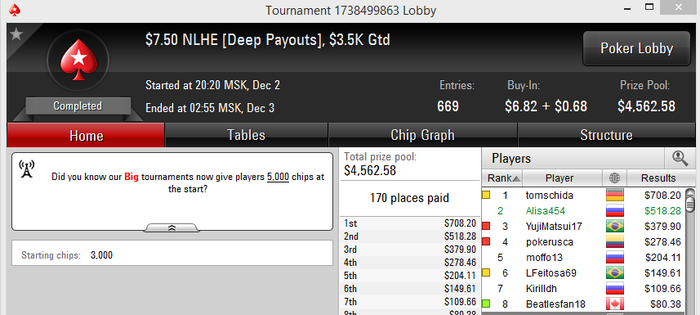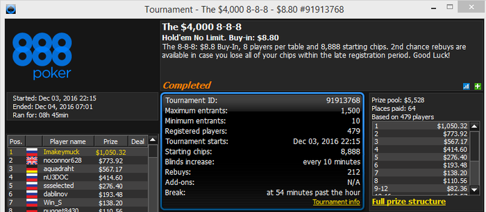 Наконец-то закончил сессию, доволен вроде да, но мог и больше, в 7.5 вылетел 20 (( Обидно набил около 400 + $ и аут (, но 8-8-8 порадовали, был долгий ХА с Британцем, делить даже не собирался и вот ))) По ходу сессии напорол кучу ошибок, но к этому уже завтра, вернее сегодня, но позже )