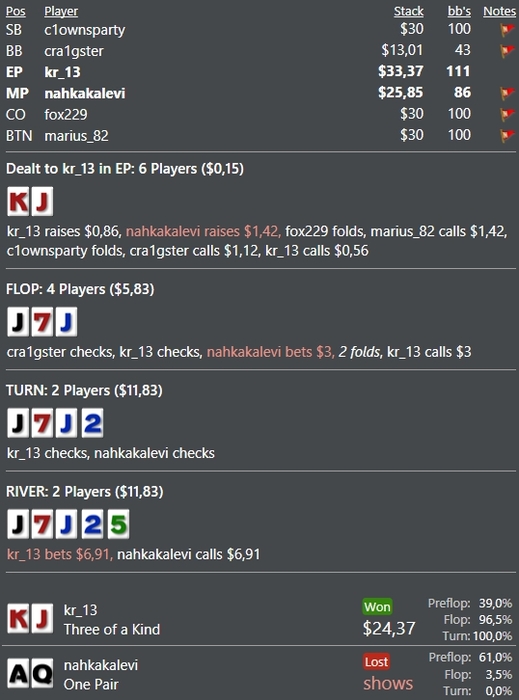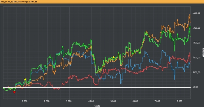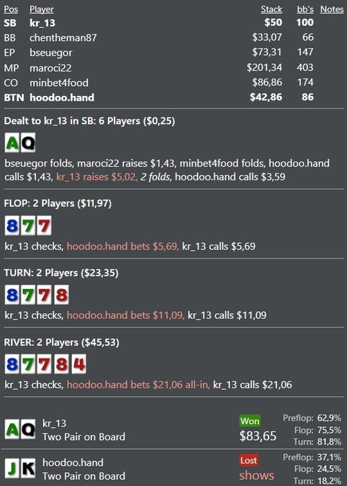 Kruk13, Было бы круто если бы ты писал еще статы оппа. Хотя бы втсд и ввсф. Что бы хотя бы отдаленное представление иметь, что за опп с нами играет. Если исходить из того, что есть я бы сыграл так же как и ты. Не одна дровина не закрылась а опп нам презентует одну руку это ak бубей, ну и пусть дальше презентует. Так же есть такая тенденция что люди гораздо шире колят ривера когда на доске фд не доехавшее, так что в моем понимании пуш ривера от оппа, после твоего кола терна это полная ерунда, так как кол терна это не кол на доезд дров, а ожидание дальнейшего блефа от оппа на ривере.