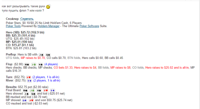 2) Находясь без позиции. Я чек-колил флоп.