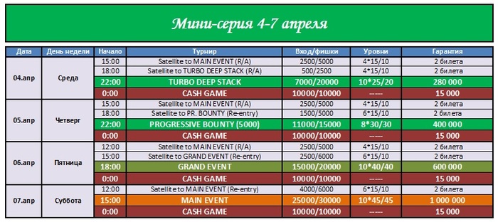 А так же о том что с 4-7 апреля у нас в клубе пройдет мини-серия с гарантированным призовым фондом более 2 млн.