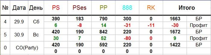 Выходные в небольшой минус. Поэксперементировал с холдемом. В воскресенье решил плотно погриндить - отыграл около 60-70 турниров. Немного замазался на восьмерках. Сделал небольшой кешаут с пати, в новый месяц с новыми цифрами. В этом месяце все-таки без холдема, только пло и пло8. Будем собирать БР для небольшой серии в конце месяца на Пати(ммт по 33). На эту неделю ничего планировать не буду - куча дел, не знаю когда получится играть. Поставлю промежуточную цель на октябрь(до начала серии на пати) - профит 1к. Осталось запастись терпением и удачей. План на игры уже есть, надеюсь расчет не пдведет. Возможно сделаю пару пакетов на выходные с более высоким АБИ. За эти выходные: Отчет за последнюю неделю (от 23.09):