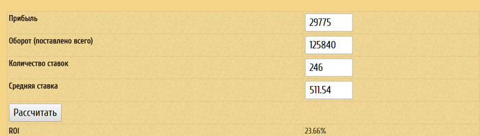 Провел подсчет профита и рои за последние 19 дней чисто для себя для мотивации и цели в дальнейшем Сделано 246 ставок за это время.Чистая прибыль +29 775р(с учетом Чп 6200р) ROI 23%,конечно дистанция не огромная,но я уверен в себе и в том что за май еще поставим и наберем ход и кол-во ставок в целом Следующий подсчет сделаю уже через 2 дня,чисто за первую половину этого месяца как раз будет 15 число
