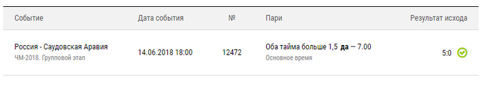 Что касается СА брать ли их гол, то думаю да кэф не плох, особенно для тех кто ставит нормально. Я буду смотреть, скорее всего возьму их гол перед матчем и после 70 мин т.к. по товарникам было видно, что сил у СА в концовках полно, а вот у наших на исходе, будто они после реальной работы играют. Будем надеется, что к 70 минуте, наши будут вести как минимум в 2 мяча, т.к. думаю, что в концовке против СА будет нашим не сладко. Как то так, надо смотреть и увидим, может наши пролетят, как муха в самолёте в этом матче, особенно исходя из товарняков. Всем Успехов.Делитесь мыслями по матчам ЧМ, очень интересно, кто что думает, особенно на первый матч.