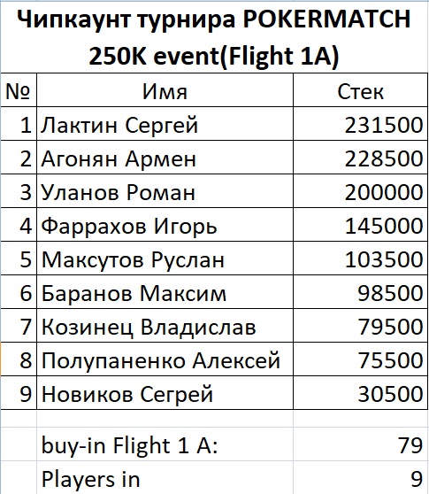 Друзья завершился первый Flight(1A) турнира POKERMATCH 250K EVENT. Поздравляем первых призеров этого турнира: Еще раз напомню! Все участники, которые прошли в Day2 турнира уже точно попали в зону призовых выплат. В том случае, если у игрока несколько стеков(отобрался в день 2 из нескольких флайтов) - 1 стек он использует для продолжения турнира - за остальные стеки получает минимальный приз!!!