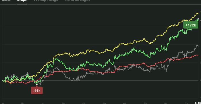 Когда перешёл на GG сперва играл рояли но мне чёт так от них стало воротить и я решил уйти в мтт поскольку было желание, да я понимал идти в мтт с бр меньше 100$ и не особо подковонным в нём идея не самая лучшая но у меня было желание и я решил уж буду играть в покер в кайф ,стал смотреть видео , старался играть каждый день много или мало но каждый день что то даже поднял но приходилось выводить так как дома не было еды и накопились долги. В итоге в один прекрасный день бр не стало;D долго думал что делать даже когда был бр уже появлялись мысли чтобы заняться чем то другим точно не сидеть у компа. Начал больше гулять, двигаться, куда то выбираться с кем то видеться. И вуаля это всё в совокупности дало мне то чего и не хватало ибо я вроде бы и не плохой игрок в покере и технически хорошо подковон но мне не хватало тех вещей по сути которые связаны больше с жизнью а не с покером. Вернулся на чико сейчас всё хорошо недавно отыграл свою самую длинную сессию 9.5ч=) Ну и графики чё есть