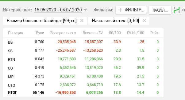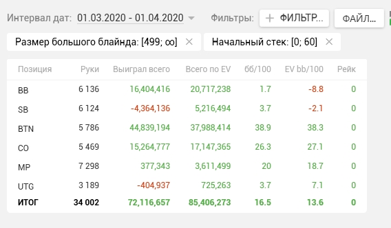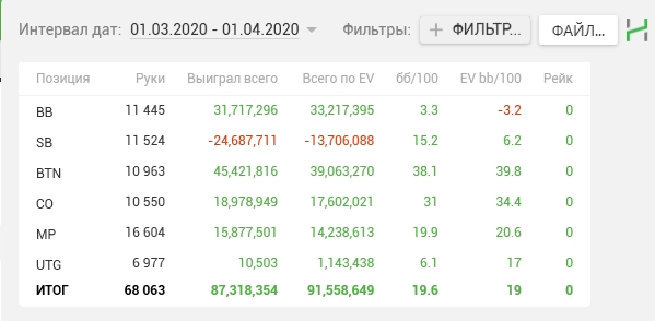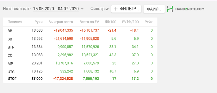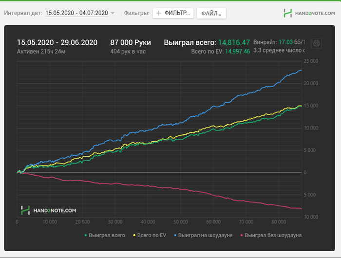 Legalize86 @ 1.4.2020 Skipaq, Саш, чёт подзабыл... Это с винамакса все графики/отчёты? Или ещё какие румы подключаешь? Тоже мтт играю немного, последнее время. Намного спокойнее спинов будет. Но долго... Как обстановка в стране, футбол не отменили?