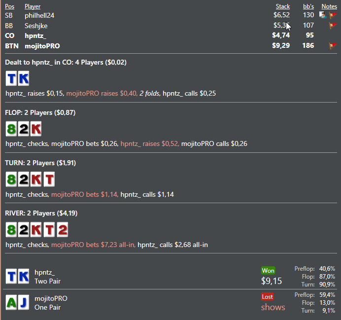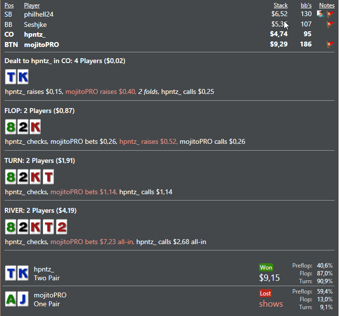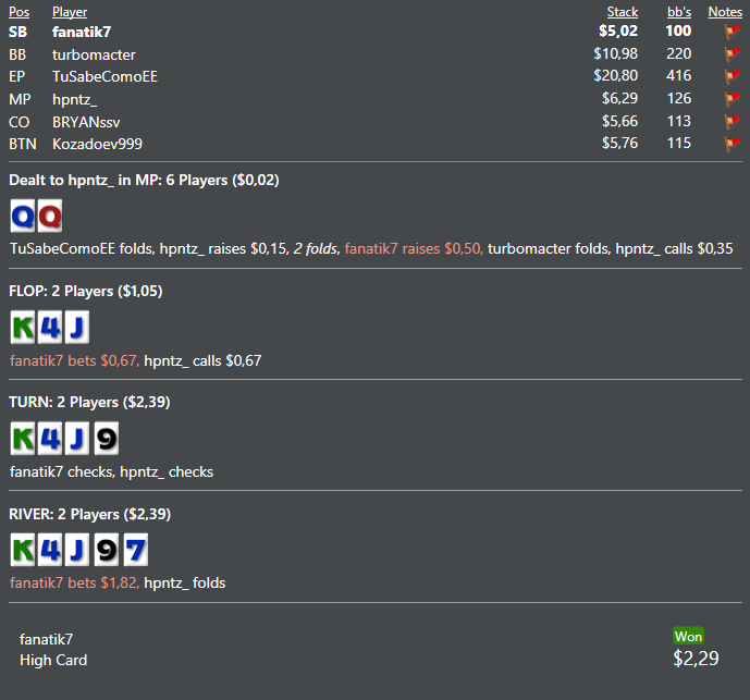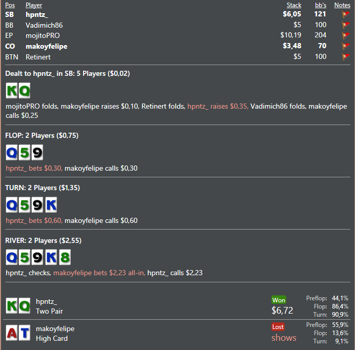 В программе как вы наверно поняли я хуево разбираюсь ))) Почему я заколил, потому что его олл ин на ривере не выглядел сильно, ибо я подумал что червовых там будет очень мало, и вряд ли он там с ними бетал всю трассу, я думал что у него там скорее всего либо АА, либо AK. Имхо если мы так на дистанции коллировать будем, скорее всего это будет минусово, но он меня душил душил, я не мог выкинуть, с двумя парами ) Хотя что он мне заложил там вообще не понятно, что хуже его руки будет коллировать две улицы, тот же AJ? =)