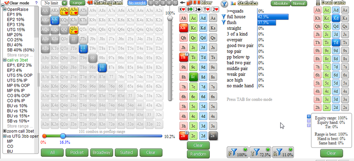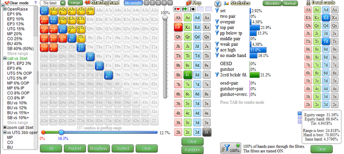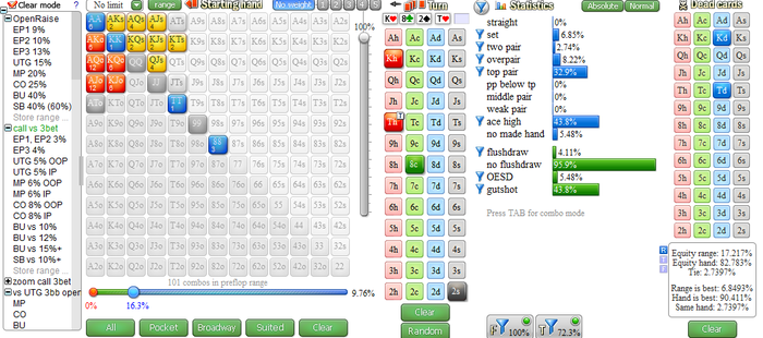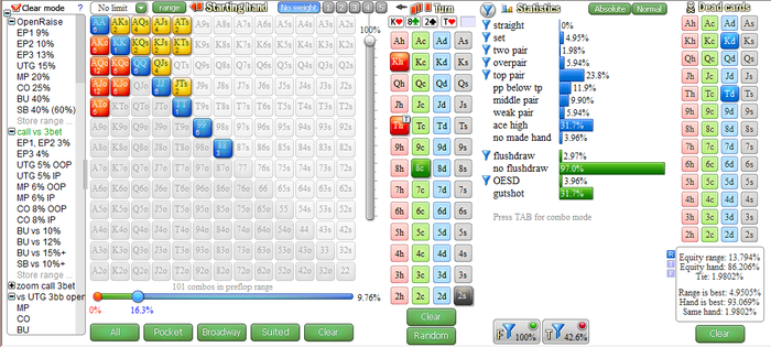 1) Забил рендж с которым он трибетит BTN vs CO там у него 16% + забил доску и эквити нашей руки составляет 70%