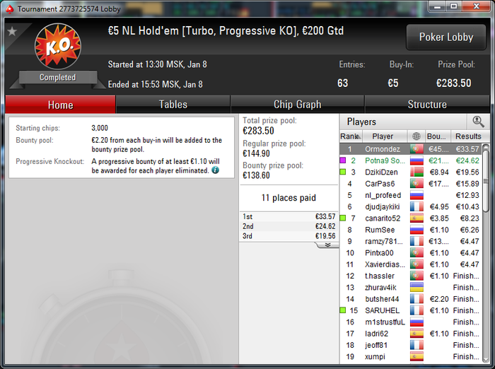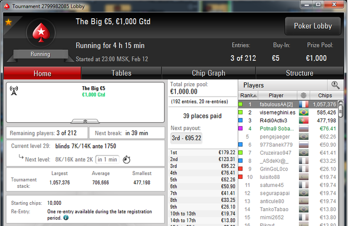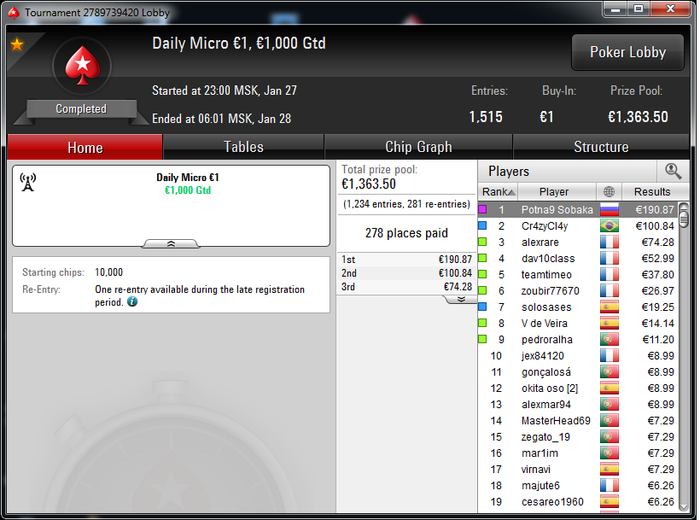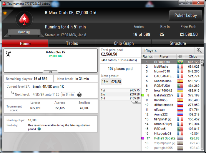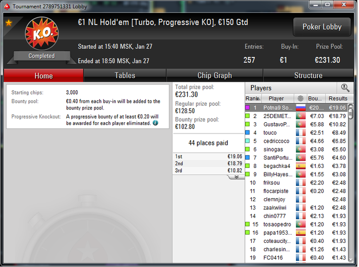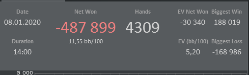 11.01.2020 ps.es -6.17 sochi -47.28 12.01.2020 ps.es +132.66 sochi -40.09 Только сейчас начинаю понимать как же классно катать только МТТ без СНГ. Куча ИТМ,куча дипов,но где то тебя фиш перехал,где то выставился позади.Ощущения непередаваемые, казалось бы минуса/минуса/минуса,а по факту чуть-чуть больше удачи,и хватит 1 заноса чтобы все отбить. Но заносы для слабаков,мы работаем на EV Дистанция все вернет,главное чтобы за 2 года успела Вчера воскресенье,куча турниров в которых играл первый раз,не мог остановиться грузить, и это после 15 часов сессии,остановило лишь то,что через пару часов надо было вставать на работку Всем GL ребзи я спать