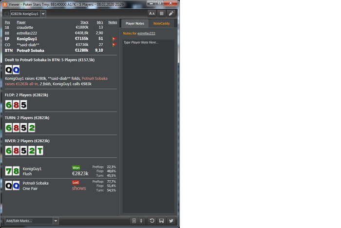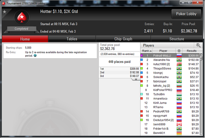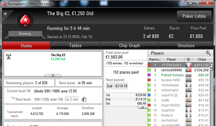 22.02.2020 sochi -17.22 ps.es -4.16 24.02.2020 sochi +156.27 ps.es -1.31 Ходил вчера на "Джентельменов" ну огонь хочу я вам сказать,всем советую,хотели меня затащить на "Соника" или "Доктор Дулитл",но я был неуступчив Сессия прошла тоже чудотворно,EV в плюсике так же был небольшой дипчик ББ7.5,большую часть турика шел 1-2,потому что невъебенно очень хорошо заходила карта,но потом где то в топ 60 как отрезало,изредка видел AJ/AQ/AK и те не оплачивались Выживали как могли,пересиживал, один раз смог вот так удвоиться