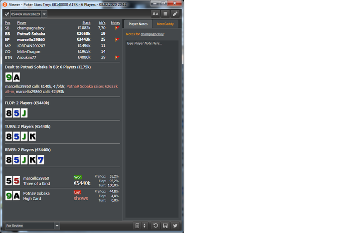 14.02.2020 sochi -48.73 ps.es -34.82 16.02.2020 sochi +108 ps.es -15.91 Сегодня в ночной было 2 дипа,один ББ за 16.5, 2 раза затащил снизу получив 2 аута на терне и ривере.Пересидел много пейжемпов ,потом раздали АКs закрыл коротыша,он показал AQs,на флопе дама,и я остался с 2 бб,вылетел 30.Второй дип в килополяне за 1.1 на финалке вот такой кулерочек,не уверен что я тут мог выкинуть ,хоть и оставался стек выше 2х коротышей
