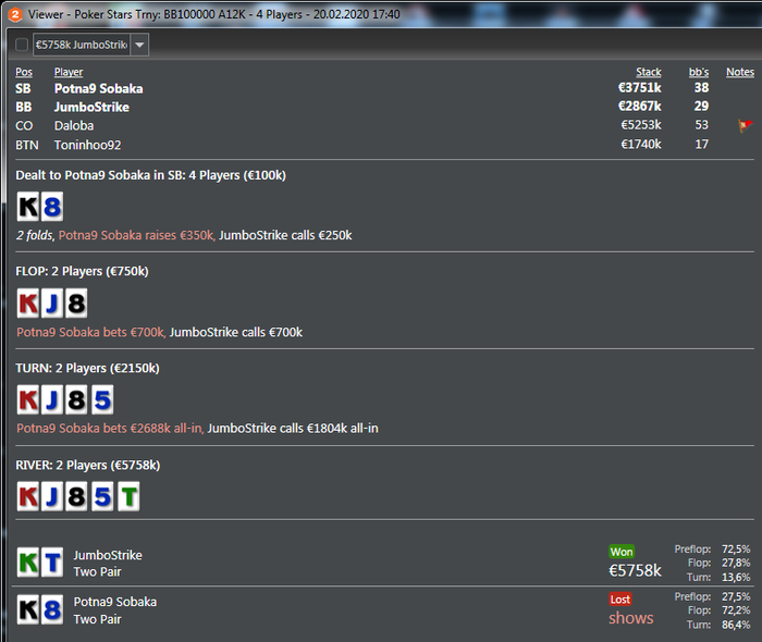 Potna9MbLLl @ 17.2.2020 Второй дип в килополяне за 1.1 на финалке вот такой кулерочек,не уверен что я тут мог выкинуть ,хоть и оставался стек выше 2х коротышей