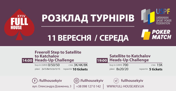 Друзья! Уже завтра, 12 сентября, в клубе Full House Kyiv пройдет масштабный Live-сателлит в турнир PokerMatch Millions (1A)! Начало в 19:00. Бай-ин - 700 гривен, гарантия - 25 билетов по 4,000 гривен! Огонь! Кстати, сателлит будет проходить в новом для Украины формате, который отлично зарекомендовал себя на серии EPT в Барселоне. Если игрок набьет стек в 135,000 фишек, он автоматически получает билет в турнир. В том случае, если у игрока останутся фишки сверх этого, то он сможет побороться за второй билет в турнир! Начать борьбу также вы сможете с бесплатного фриролл-сателлита в 14:00! Удачи!