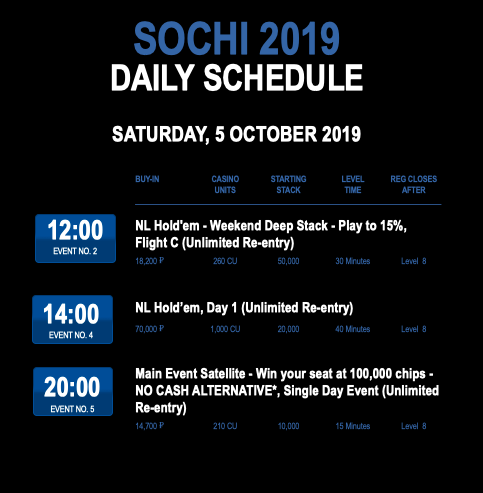 5 ОКТЯБРЯ 2. 12:00 18200 RUB Флайт С NL Hold'em - Weekend Deep Stack - неограниченные ре-энтри- игра до 15% 4. 14:00 70000 RUB День 1 NL Hold'em - неограниченные ре-энтри 5. 20:00 14700 RUB Однодневный Main Event Satellite - выиграй место за 100,000 фишек - неограниченные ре-энтри