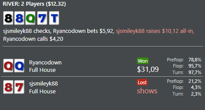 Ривер без комментариев, тут мы не должны были оказаться в таком спре. Если уж оказались, то допихиваемся в надежде что нам заплатят дамы (уже могут и не заплатить) или восьмерка, или чудо-юдо флеш. Чек бессмысленный, если он колил наш ререйз, то он не пустой