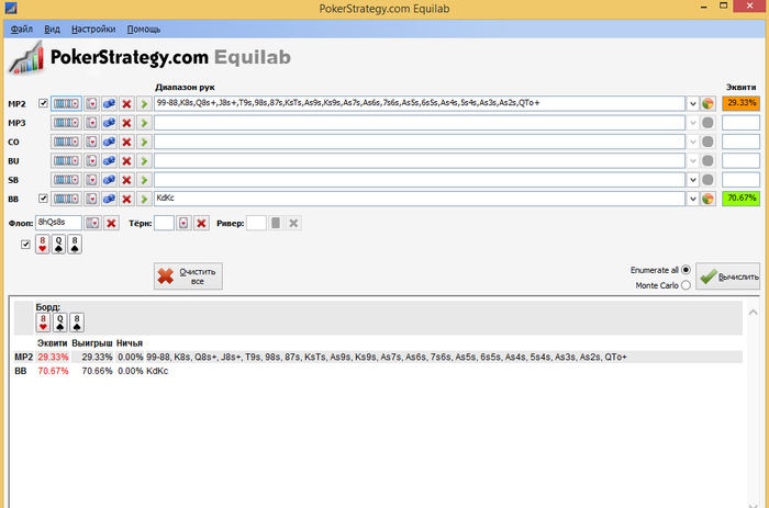 По итогу можно думать, что из всего этого многообразия его говнорук, он тут вколит почти по любой своей даме очевидно, по любой 8-ке, коих у него должно быть какое-то количество (98s, 87s, надеюсь мастевые гэпы он не липмит с ранней, даже учитывая, что фиш; какие-то K8s, Q8s, может какие-то J8s даже, уже не знаю) и всем своим дро с пиками. Еще T9s. Я думаю, что разномастные низкие коннекторы у них тут не часто увидишь, поэтому T9o тут не должно быть, мне кажется. Ну и какие-то карманки тоже, вероятно, полетят в тебя в каком-то проценте случаев (не знаю, насколько чел вообще думает о том, что происходит за столом).