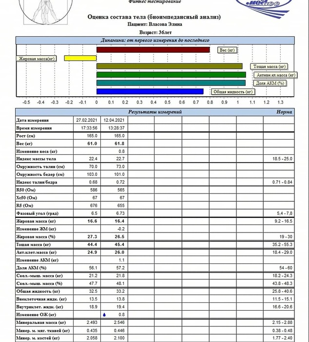 По сравнительно у анализу видно, что удалось набрать 600гр мышечной массы и скинуть 200 гр жировой. И это при том, что особенно за питанием я не следила и тренировки были средней интенсивности.