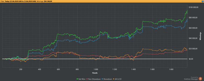 Из интересного-запоминающегося, пожалуй, было только то, как мне в 4-вэй споте в раздаче где-то в первый час игры с KTo закрылся ривером стрит, удалось получить проплату с двоих. Но там уровень игры не сильно высокий, ребята проставляли флоп/терн по блайнду и спокойно давали мне возможность закрыть по шансам мою двухсторонку. В итоге оба вышли на шоудаун лишь с топ парой (4-ый игрок, как оказалось, также выкинул топ пару, - у всех было в рукаве по Q, лол), было приятно тот банк забрать, появилось ощущение, что вот, может сейчас получится. Но нет. Пока остальным исправно развали топ диапазона AA, KK, AQ, AJ и карманки средние-низкие, максимум, что я получил - это AQs перед аддоном (и ни одной карманки за весь вечер), которую плохо разыграл на префлопе, а на постфлопе вышла спарка KK, в которую мой опп, конечно, удачно попал со своим K :) Благо я там ничего не отдал.