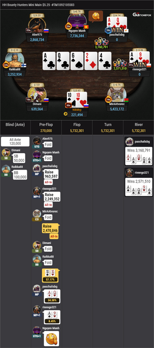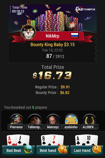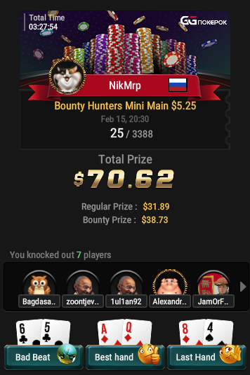 Очень не сложился минимэйн за 5$ c норм призовыми, в топ 35 шел с топ 1, но сначала АК<B10 по 29бб проиграл, далее с 1010, которую в раздачи засунул за 2 норм баунти монетку не затащил, жаль.