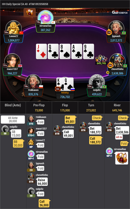 vfadeev1986 @ 11.01.22Вот здесь я не соглашусь , хоть и не достиг успеха в покере. МТТ - это другое направление покера , и более сложное... Потому что в МТТ начальный этап турнира , по большому счету , эквивалентен Кешу с анте , но накладывает свой отпечаток постоянный рост анте и блайндов . Так что , чем дольше турнир продолжается , тем больше участников оказывается в ситуации , что у них меньше 20 ББ , и им нужно ставить All in или фолдить ... И задача в МТТ оказаться в ситуации с остатком фишек менее 20 ББ как можно позже ... Так что , спин энд го - это эквивалент поздней стадии турнира , когда стек уже короткий ...