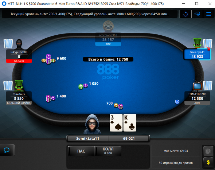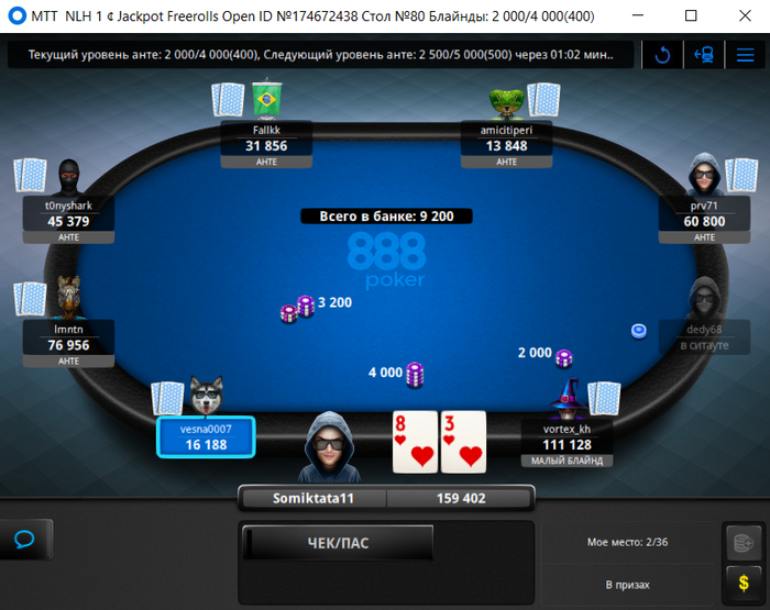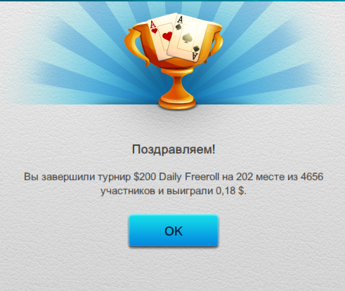 Somiktata, спасибо! Мне дали один билет за регистрацию. На гипер турбо. Но он для быстро кончился С такой же скоростью, как и блайнды меняются. Но 20 минут я продержался. А больше, ни рулеток, ни билетов... Ну да ладно, посмотрю как и что там. Ориентир теперь есть.