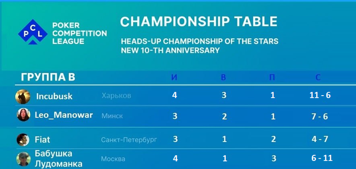 Тем временем, Бабушка Лудоманка выходит на 3-ю строчку! Лео же может быть доволен тем, что в первом матче он победил Ольгу с лучшей разнице в счете. Именно за счет этого, не смотря на одинаковое количество выигранных поединков (набранных очков) с Ольгой, он находится на строчку выше (3-1 первый матч он выиграл, а 2-3, как мы знаем, уступил сегодня)