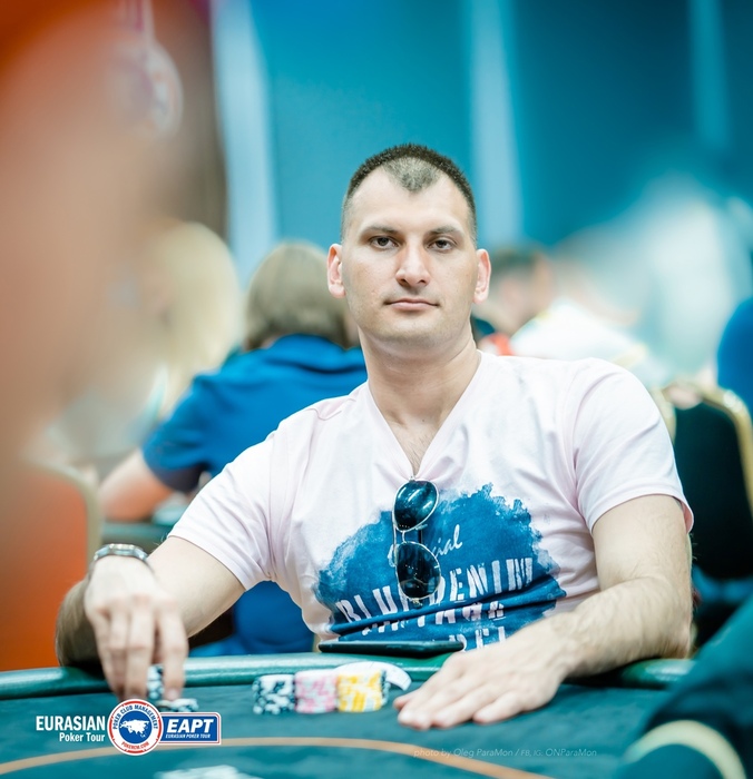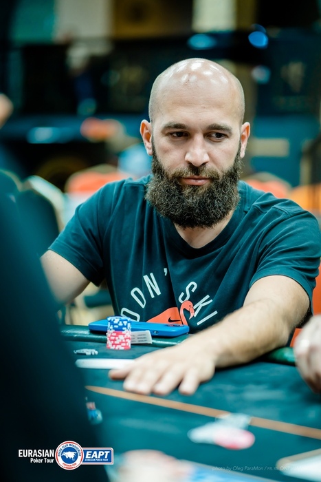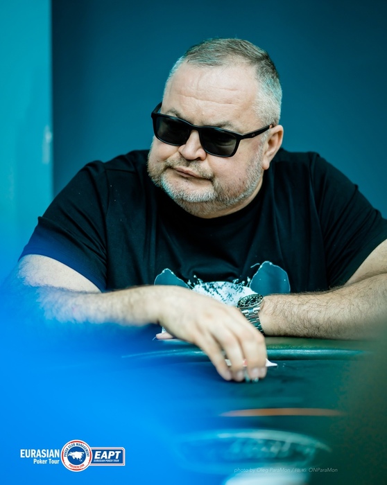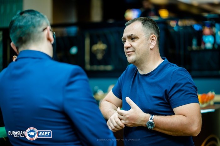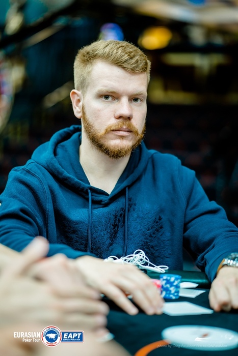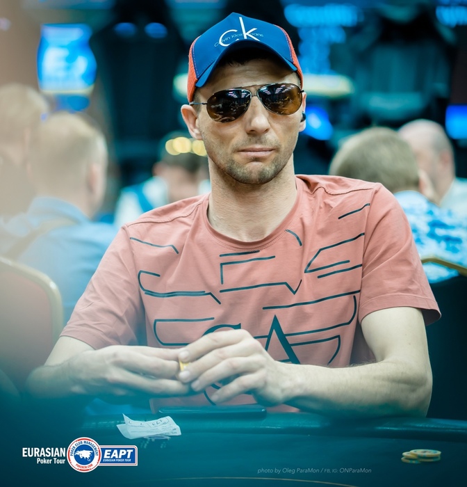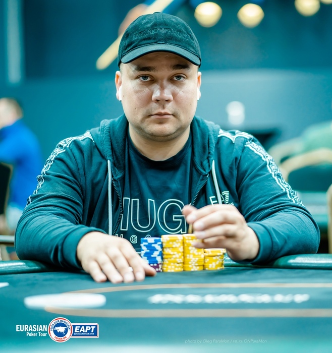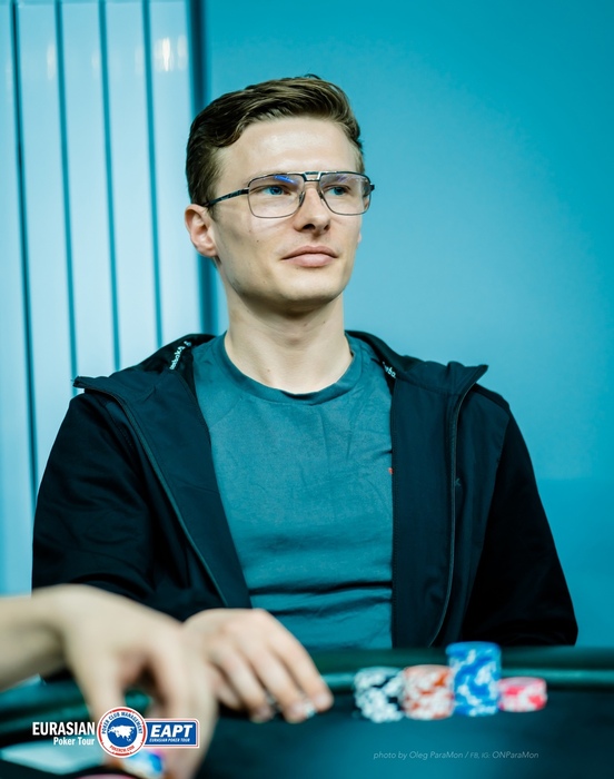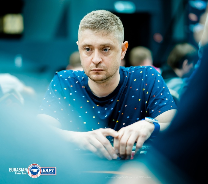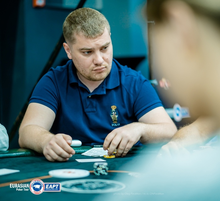 Александр Дмитриев открылся минимальным рейзом 12,000 из первой позиции, Александр Гаврилов - колл на второй, Марк Узденов - колл на третьей, Максим Полосьмак - колл в середине. "Ну, по старой схеме, не глядя", - объявил Александр Евстигнеев на большом блайнде и кинул вперёд все остававшиеся у него фишки (10,000).