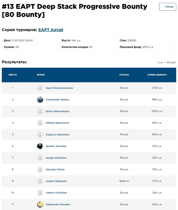 Доска - . Данил Мирошниченко стал победителем турнира, забрав 2725 у.е призовых и заодно солиднейший нокаут за Вячеслава.