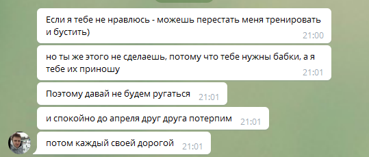 Прочитал всю тему, странно что игрок решил так поступить почти в конце контракта, если бы он сделал это через неделю-месяц после начала, объяснив это тем что тренер его не устраивает по объективным причинам - было бы логичнее. А так из-за оставшихся 1000 турниров получать такую тему, негатив от людей, оправдываться в теме, разве это того стоило? Если честно, со стороны выглядит просто как желание насолить тренеру из-за какой-нибудь обиды. Мне кажется куда лучше быть честным для себя и коммьюнити, пусть и потратив 25% профита за месяц (или даже 5 дней) для этого (раз уж договорился на эти условия и в переписке их не отрицал), жизнь ведь куда длиннее этих 1000 турниров.