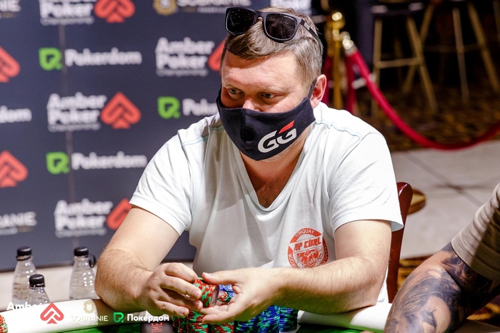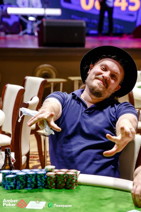 Сергей Нарожный остался с семью блайндами. В раздаче против Аратцева (SB vs BB) был банк 400К на префлопе, флоп прочекали, на тёрне Сергей заплатил 140,000, ривер опять сыграли чек-чек. Аратцев показал и забрал фишки. У него примерно 2,2 миллиона.