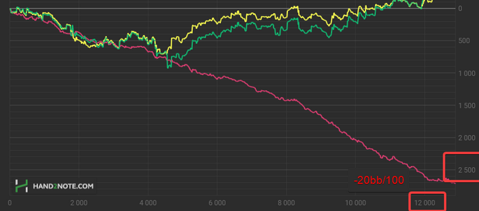 Встречал людей с такими же перекосами в статах, которые на нл10 только приближаются к слабому плюсу. Так там 4 и 5 бет на поздних позициях почти 4%.