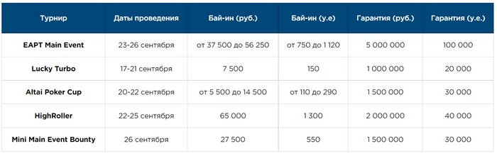 Чтобы успеть на самые сочные турниры EAPT Алтай, вам нужно прибыть в Altai Palace не позднее 21 сентября. Тогда вы сможете размяться в недорогой турбине Lucky Turbo (бай-ин 7 500 рублей, гарантия 1 000 000 рублей), сыграете в Altai Cup, а также в полном объеме захватите остальные ключевые ивенты: главный турнир, турнир хайроллеров и мини-мейн с баунти. Вот какие события вы зацепите: