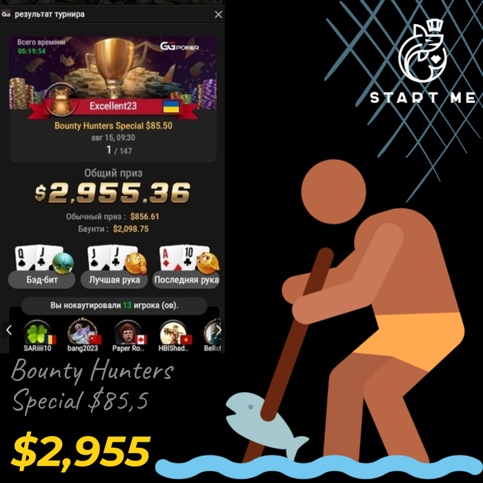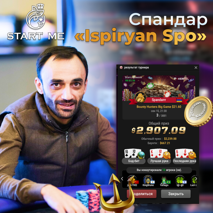 Не менее боевой провел свой турнир и Спандар на GG. 13 нокаутов🥊 в Bounty Hunters Big Game $21.60, Топ-3🥉 и $2,239.88 + $667.21. Общий банк - $2907.💰