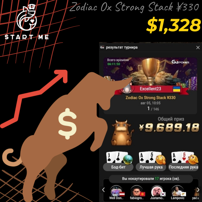 Алексей Excellent23 пытался выжать с китайских покерных столов на GG максимум. Как итог: 🥈Top-2, 🥊10 нокаутов и ¥9844 ($1340) призовыми. Турнир: Zodiac Ox Strong Stack ¥330.