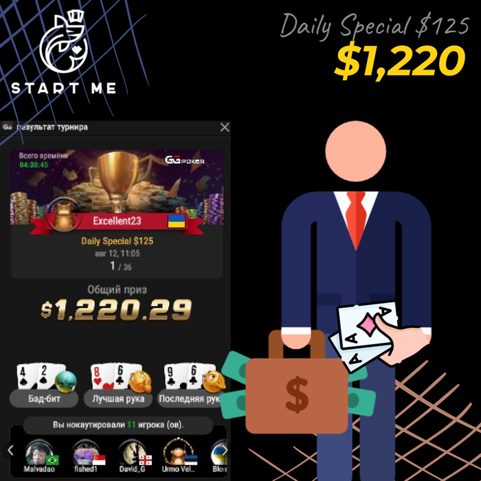 Первый из турниров проходил на GG: Daily Special $10. Алексей берет Топ-1🥇 и $661 призовыми.💰 Отличная игра с девятью нокаутами, туда их!🥊