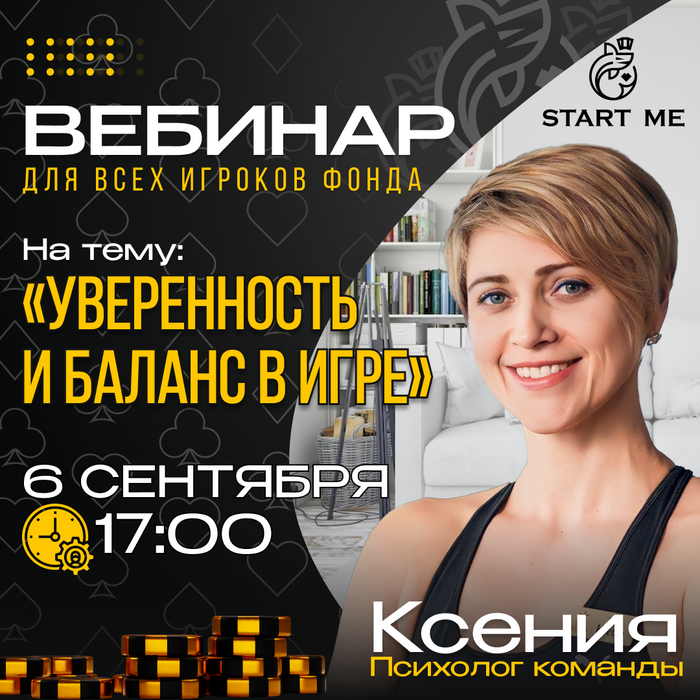 Приглашаем принять участие в этом захватывающем вебинаре, где психолог команды, Ксения, поделится с вами секретами уверенности и баланса в игровом мире.