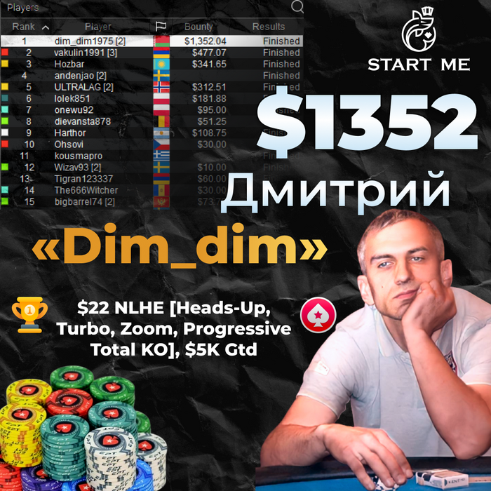 Дмитрий dim_dim1975 находиться в замечательной форме и показывает отличную игру на PokerStars. 🥇Top-1, $1352 на $22 NLHE [Heads-Up, Turbo, Zoom, Progressive Total KO], $5K Gtd. Так держать!