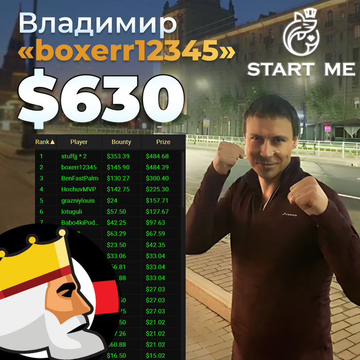 Владимир неплохо показал себя на PokerKing заработав $145 + $483 bounty. Топ-2🥈 на $8.80 PKO $6000 Gtg. Общий банк: $630!💰