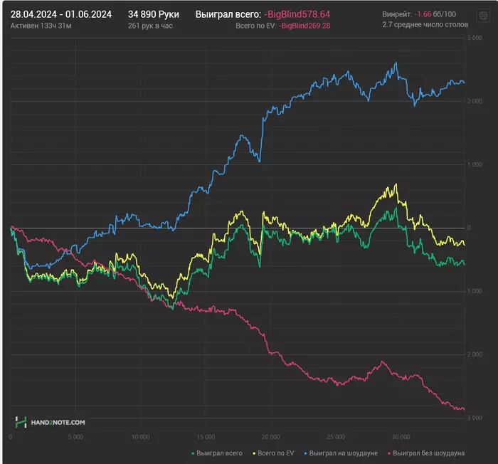 Последний полугодовой стрик сильно попортил мне общий винрейт. Он уже приближается к 3 бб/100, превращая меня просто в какого то слабоплюсового рега. Надо координально пересмотреть свою, что не так с моей игрой. Может слишком на автопилоте играю и надо это исправлять, может какие то фундаментальные концепции еще не осознал, может сильно не добираю с фишей, может селект не такой, или не справляюсь с фолдом на ривере, не знаю. Придется работать над этим, если хочется выбраться из этого дерьма и идти вверх по лимитам. А я хочу.