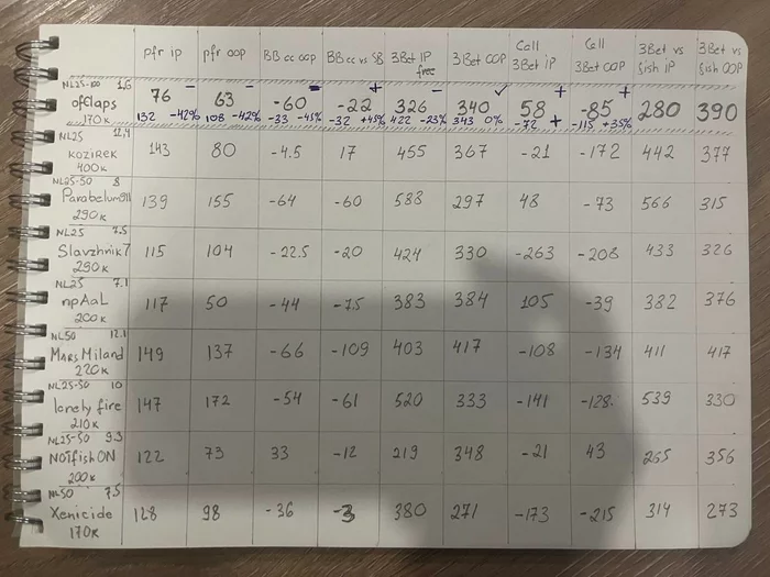 Всем привет ребята. Сейчас у меня просто какойто покерный штиль, времена тяжелые, это влияет конечно на все, на мотивацию, на уверенность в себе и т.д. Но в последние дни нашел в себе мотивацию, благодарен тренеру, что решил провести треню по оценке моей игры, это всегда настраивает на рабочий процесс и придает мотивации изучать покер. Так вот, я решил наконец нормально проанализировать свою игру, найти где я лью и недобераю. Я вообще давно хотел это сделать, но руки никак не доходили. Я взял 8 игроков с лимита с более менее длинными дистанциями и хорошими винрейтами и прогнал по фильтрам их и сравнил с моими. Сравнивал со среднеарифметическим. Вот что получилось.