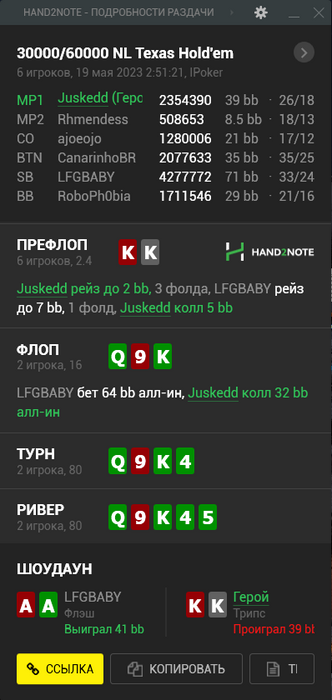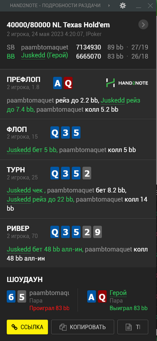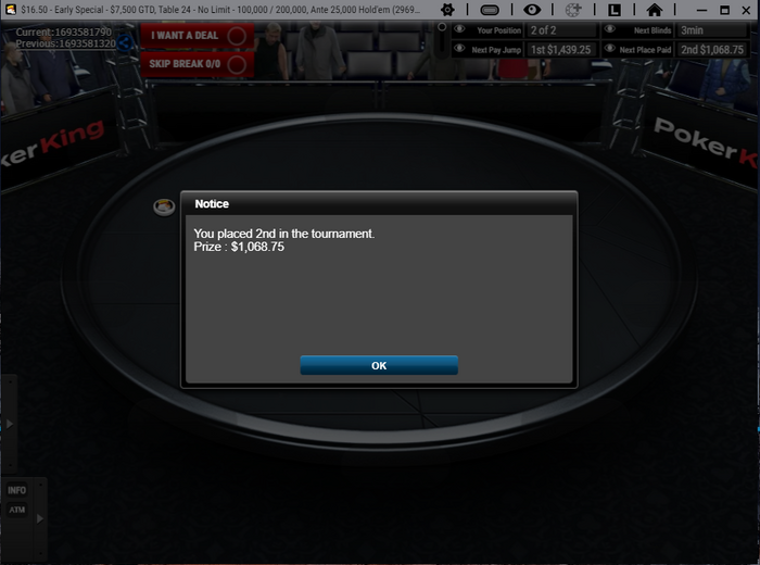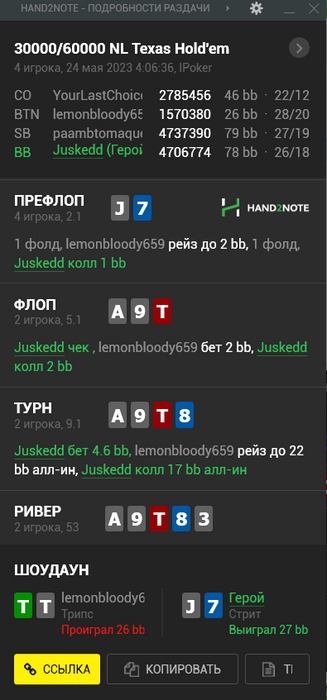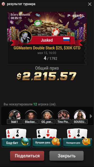 Ну а в хедз-апе противник просто подарил мне стэк, положив меня на блеф. Справедливости ради скажу, что до этого он пару раз блефы вскрывал успешно, но не в таких масштабах конечно.