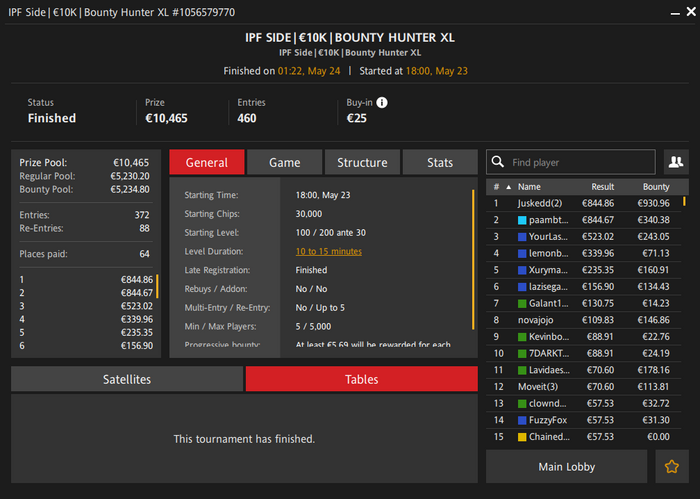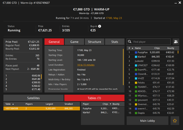 Что касается скорости турниров, то в загрузке исключительно турниры с ростом блаиндов от 10 мин. и выше. Несколько баунти-турбин добавляю только под конец загрузки.
