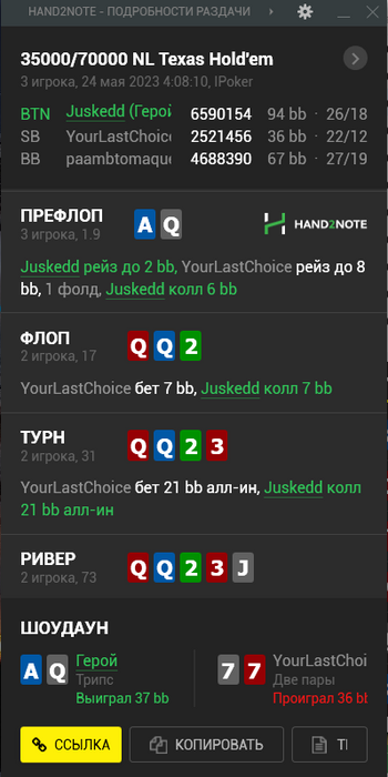 Во втором случае сначала в 5 максе выиграл важную монету QQ > AK за стек в 90бб.