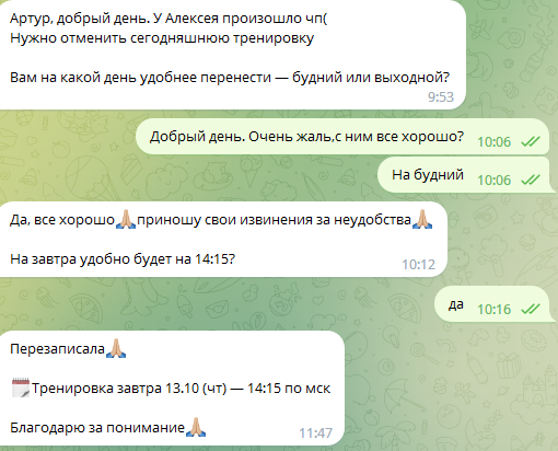 В день тренировки со мной связалась его менеджер и попросила перенести тренировку, т.к. у Алексея ЧП.