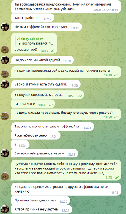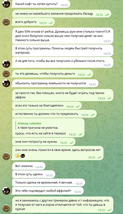 Этой перепиской я не хочу сказать что Алексей не прав. Он имеет полное право отказать мне. Я лишь хочу показать сущность этого человека и предупредить об этом тех, кто вдруг хочет начать с ним сотрудничать.
