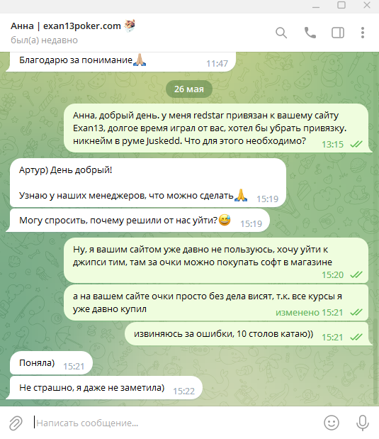 Я играю Redstar от Экзана и мне за рейк начисляются очки на его сайте, на которые я могу купить его курсы. Проблема в том, что я разочаровался в его курсах, в его видении игры и мне эти очки попросту не нужны. Я стал искать возможность отвязать редстар от его аффа и перейти к GT+, т.к. здесь на очки можно покупать различный софт и продлевать подписку на шарк. Написал его менеджеру.