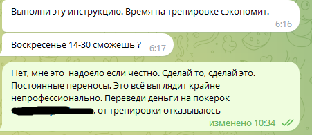 И вот этот человек называет себя профессиональным тренером + психологом. Я уже не выдержал, отправил ему голосовое сообщение где сказал что какое право вообще имеет со мной так общаться, и указал на то, что тренировка не бесплатная и я за неё заплатил реальные деньги, на которые он может сходить купить себе черной икры и шампанского (или чем он там питается), и я не прошу её провести из жалости. Ну и добавил что он охуенный психолог, если так общается со своими клиентами.
