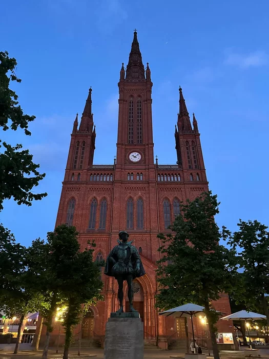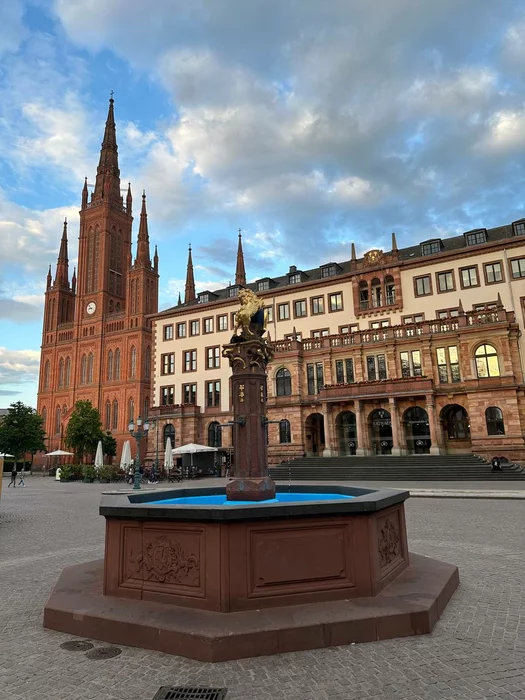 В Германии живёт наш друг, поэтому за 4 дня до начала чемпионата приехали повидаться с ним и заодно посмотреть Франкфурт и его окрестности. В первый классный город попали, можно сказать, случайно. Вечером решили сгонять в Майнц и уже незадолго до нашей станции машинист сказал, что в него не поедем(поезда здесь частенько опаздывают или отменяют остановки - мое первое немецкое удивление), а едем дальше - в Висбаден. Я и не знал про его существование, а оказалось это столица округа Гессен, на секундочку - того же, где находится Франкфурт. И, то ли на контрасте с маленьким городком, в котором мы были днем, то ли и правду Висбаден хорош, но мне прям очень зашло! Такие красивые улочки здесь с интересными домами, в центре - классная церковь, смотрится как будто бы в 3Д. Не, ну так то я понимаю, что они все 3Д, но вот когда смотришь на здание какое-то спереди, похоже же на 2Д обычно? А тут прям 3Д! Жаль, что было у нас часа 4 всего на этот город, как будто бы не хватило.
